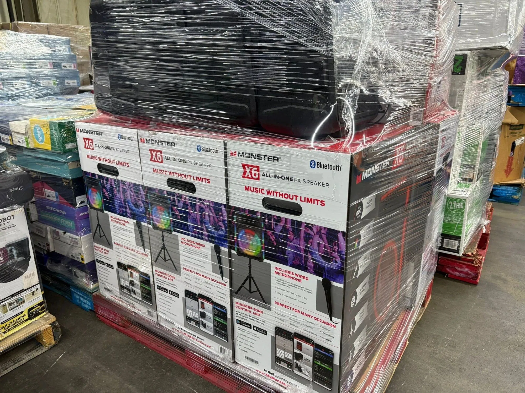 <p><img src="https://cdn.marblism.com/-EV4g00Vo6O.webp" alt="Pallet of Monster X6 All-In-One PA Speakers, Bluetooth enabled, boxed and shrink-wrapped for wholesale auction."></p>